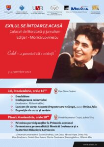 Uniunea Scriitorilor din România (Filiala Craiova), Uniunea Ziariștilor Profesioniști din România (Filiala „Tudor Arghezi”, Craiova), Asociația Culturală „Carmina Balcanica”, Editura „Aius” și revista „Mozaicul”, organizează în perioada 3 – 4 noiembrie 2022 evenimentul cultural intitulat „Exilul se întoarce acasă. Colocvii de literatură și jurnalism. Ediția I – Monica Lovinescu”.